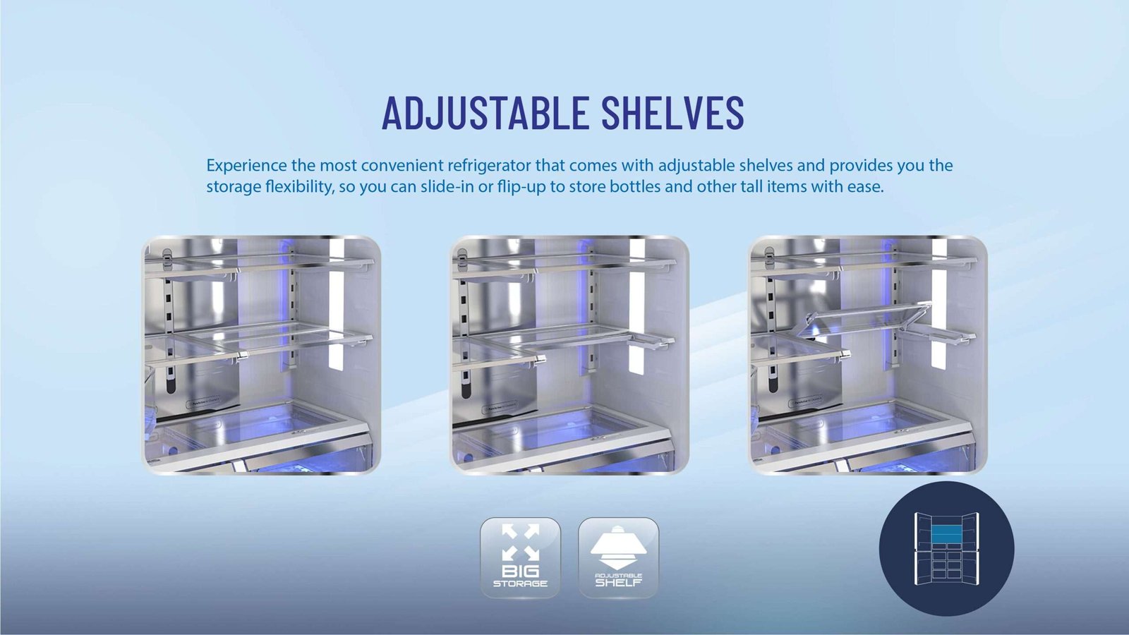 | No. of Shelves(Total) | 4 Split (3 Adjustable + 1 foldable) | ||